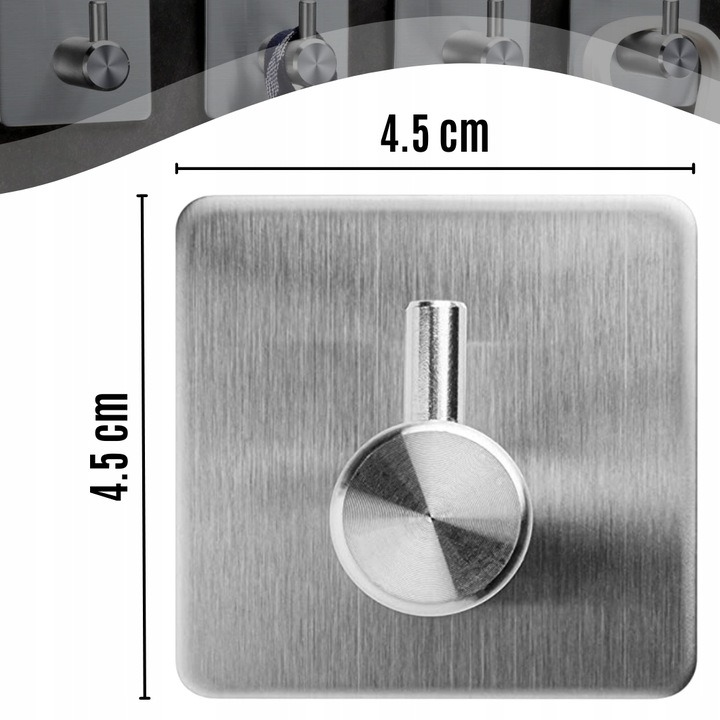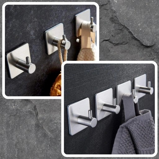 Zestaw czterech, samoprzylepnych haczyków w kolorze srebrny mat. Minimalistyczny, loftowy design. Doskonale sprawdzą się w kuchni, łazience, przedpokoju czy korytarzu. Wykonane z metalu i bardzo wytrzymałe. Dzięki zastosowaniu samoprzylepnej taśmy 3M montaż odbywa się bezinwazyjnie. Nie trzeba wiercić dziur w płytkach czy ścianie. Wystarczy przykleić wieszak za pomocą bardzo mocnej taśmy, która jest w zestawie.